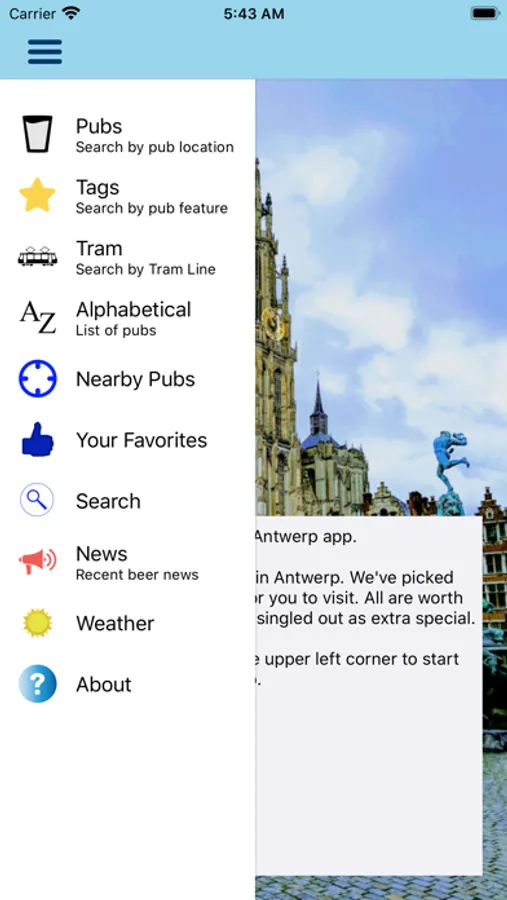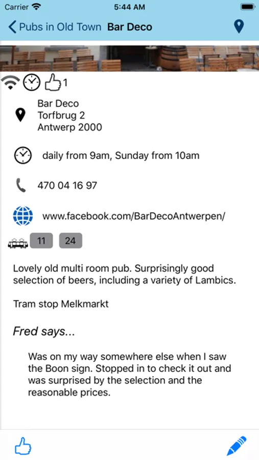 Each entry contains a review, photograph, nearest tram line, contact info, and website for each pub. . A map will show the location of the pub as well as nearby listed pubs. Check the weather forecast or flag your favorite pubs for future reference -- and see which pubs others have favorited.