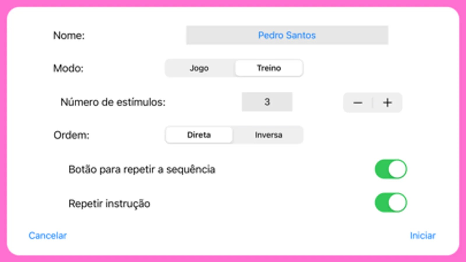 - Modo TREINO: O jogador escolhe o número de estímulos a serem trabalhados (2 a 10); desta forma é possível treinar um nível específico de acordo com a dificuldade de cada indivíduo.