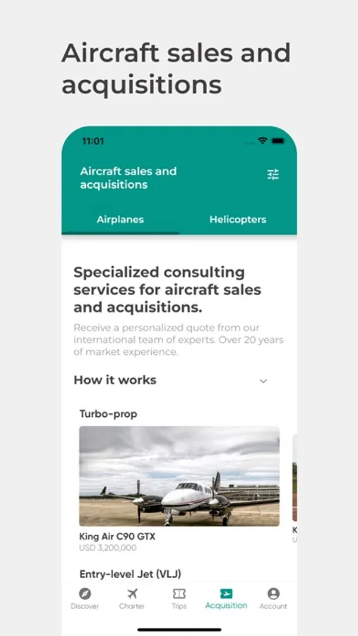 ◉ On-demand charter: Choose from more than 100 different types of private jets, turbo-props, and helicopters and get an instant quote.