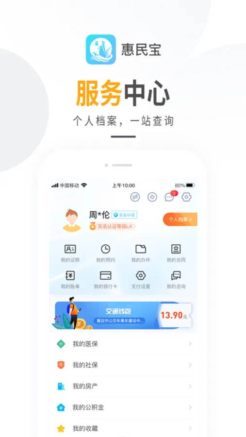 1.身份一认证 信息掌上摁:户籍、五险、公积金、健康档案、车辆、证件照等个人信息。记录一生、管理一生、服务一生,比你更懂你;