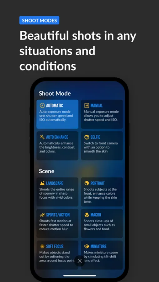 Pixel+ Camera allows you to shoot in different modes such as landscape mode, macro mode, sports mode, night scene, sunset scene, or other modes according to the scene conditions; moreover you can beautify your photos with its built-in 30 live filters.