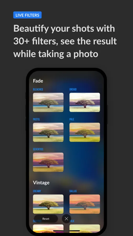 Beautify your photos with 30 live filters which you can see the filter effect in real-time.