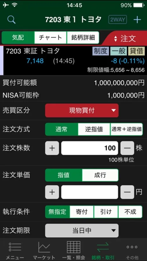 ・「逆指値」「通常+逆指値」を含む通常の発注スタイルはもちろん、最良気配を表示したボタンを最短1タップするだけで発注が可能な2WAY注文も搭載しています。