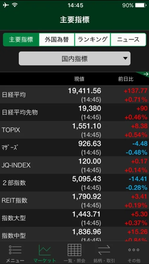 ・値上り/値下り率、出来高、売買代金、出来高急増など、豊富なランキングを全市場/市場別から選択して表示可能です。