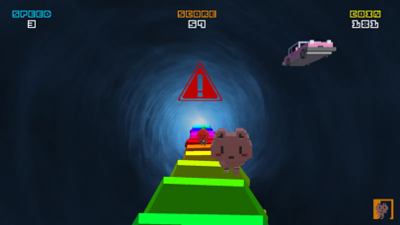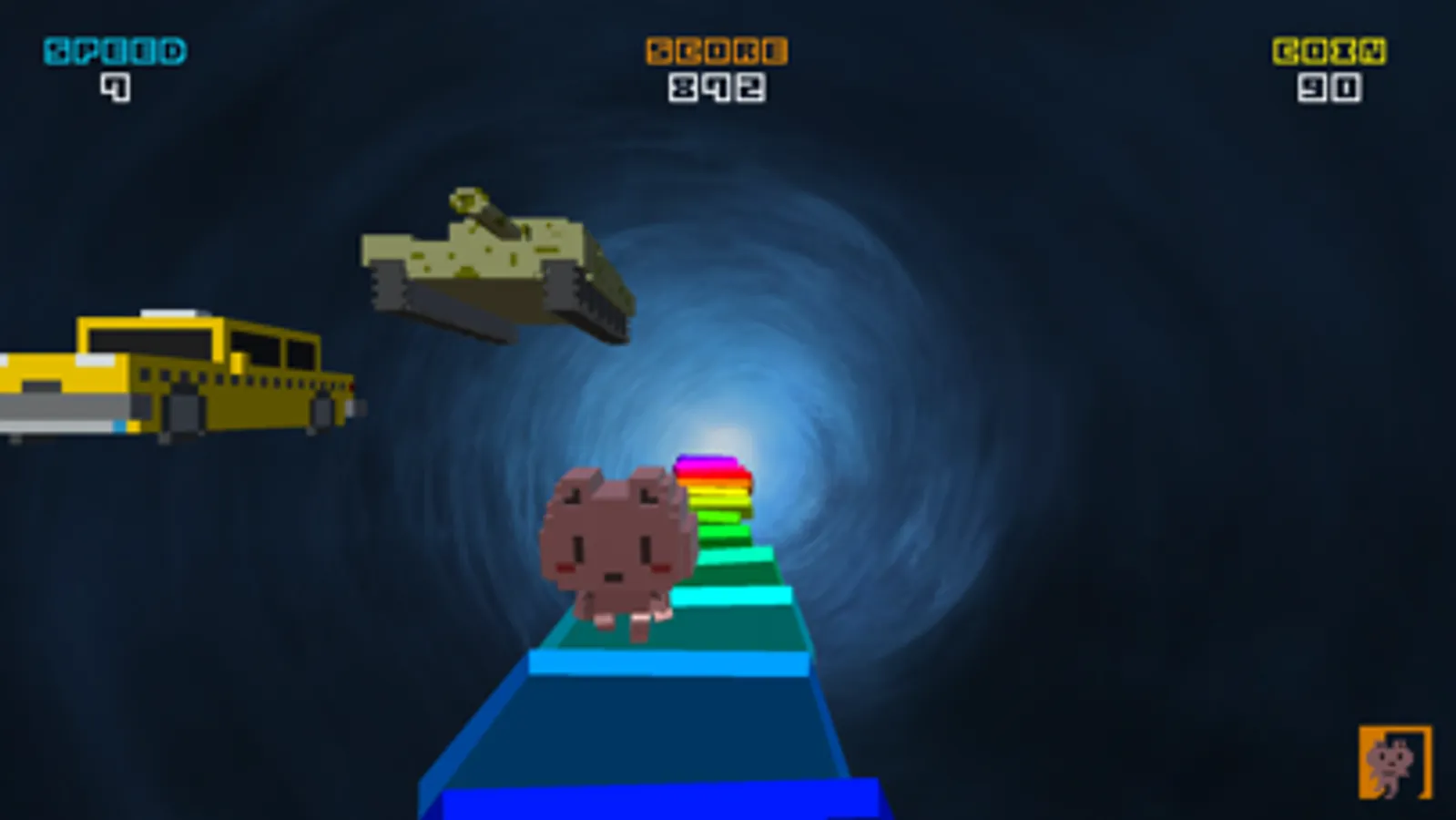 Train, Tank, Toilet, House... Run to the various blocks floating in space.