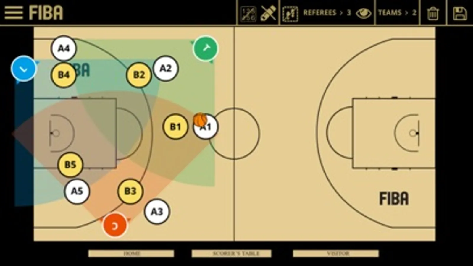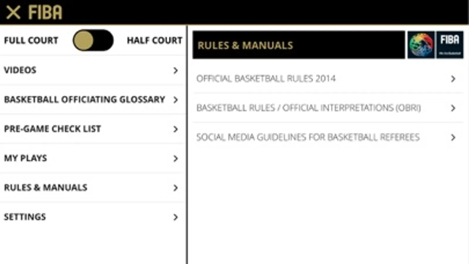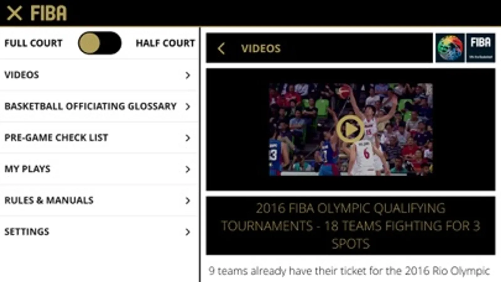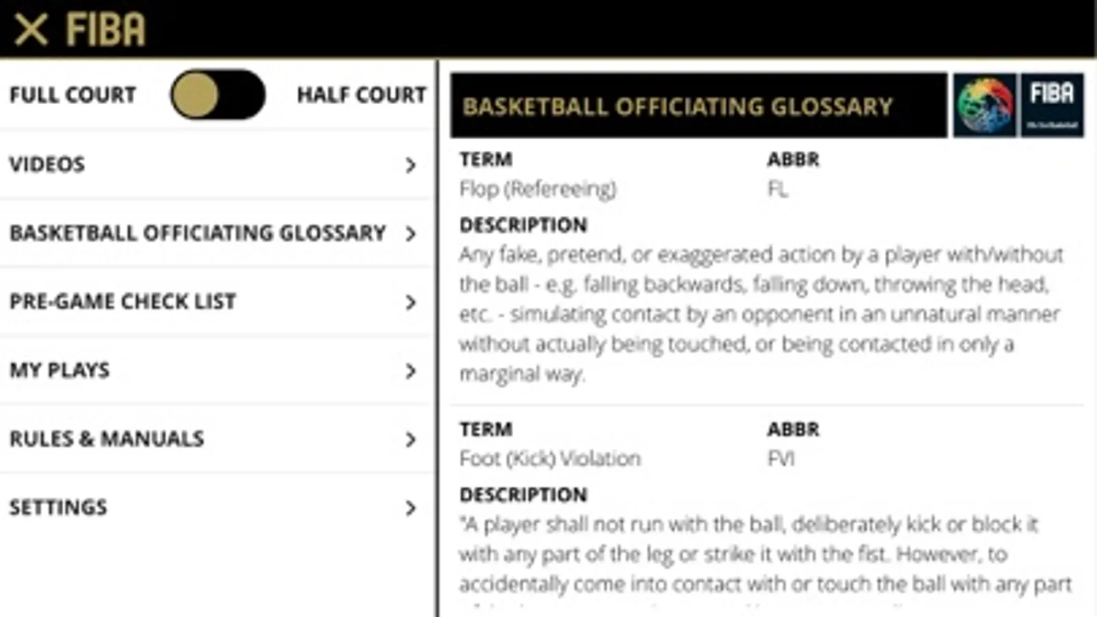 Includes videos, basketball officiating glossary, pre-game checklist with designated groups for officiating, technical manuals, FIBA basketball rules and official interpretations (OBRI), full & half court with referees, players, coverage area symbols, drawing tool, able to save your own play-situations.