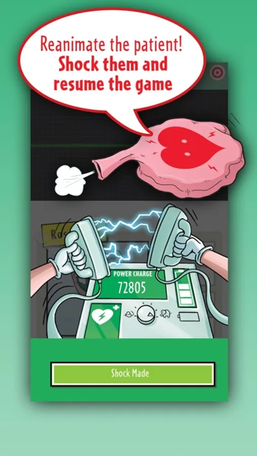 When a cardiac arrest occurs, after the electro-shocks, make sure that one player presses the "shock given" button to validate the given code. It is possible that the patient heartbeat won’t recover at that point. If this is the case, a new code will appear and the electro-shocks will have to be re-applied.
