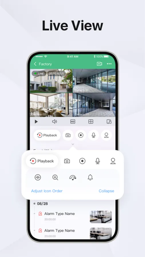 The Guarding Vision app is designed to work with DVRs, NVRs and IP cameras which support Cloud P2P function. It allows you to live view your cameras remotely. All you need to do is creating an account and adding device into the account, then you can enjoy the real-time video from cameras on a global scale. It also allows you to play back recorded video to search every milestone of your life. When motion detection alarm of your device triggered, you can get an instant message notification from Guarding Vision app.