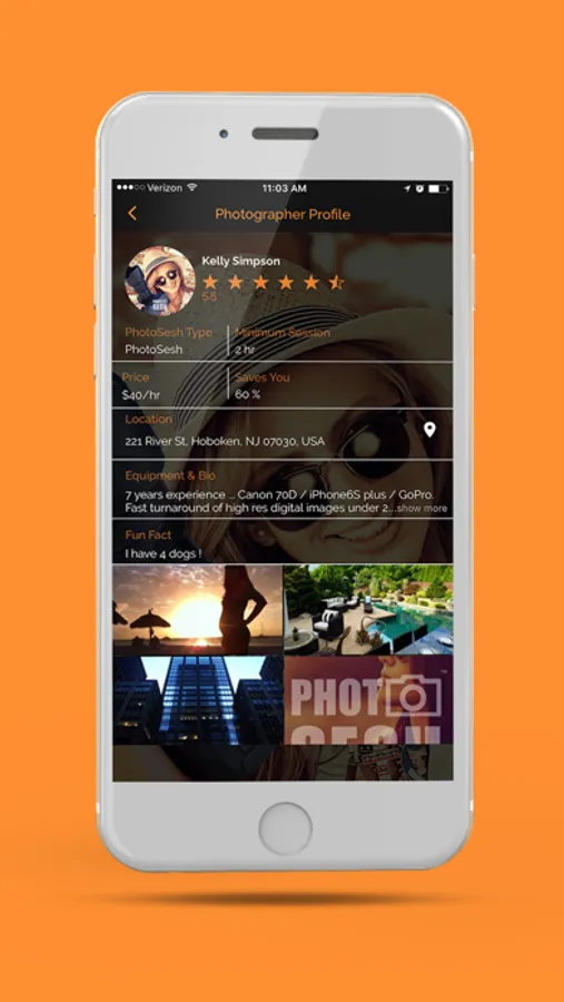3. Photographer profiles, including bio, equipment, portfolio pics and customer ratings.