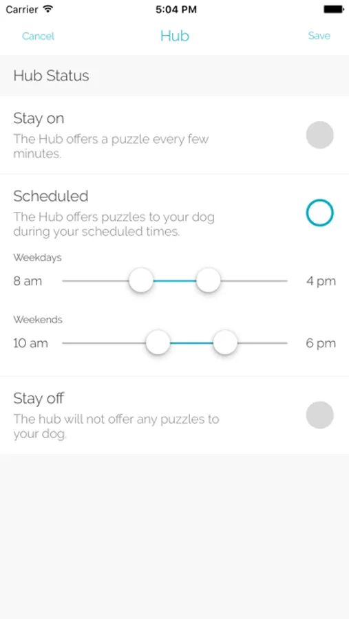 The CleverPet app integrates with the CleverPet Hub, and allows you to connect your Hub to WiFi, monitor your dog’s progress on the Hub, track the amount of food your dog has eaten, the challenge your dog has unlocked, and more. You can also schedule the Hub to start and stop at the times that work for you.