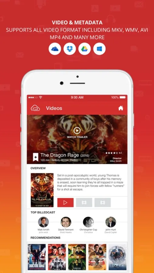 It securely works with the help of Dropbox, Google Drive, OneDrive, APIs to bring content to your smartphone and Apple TV.