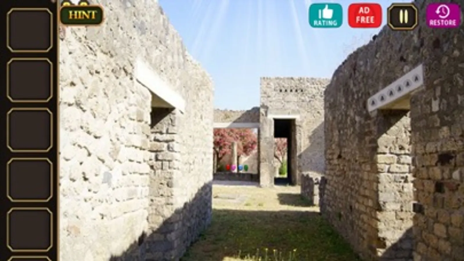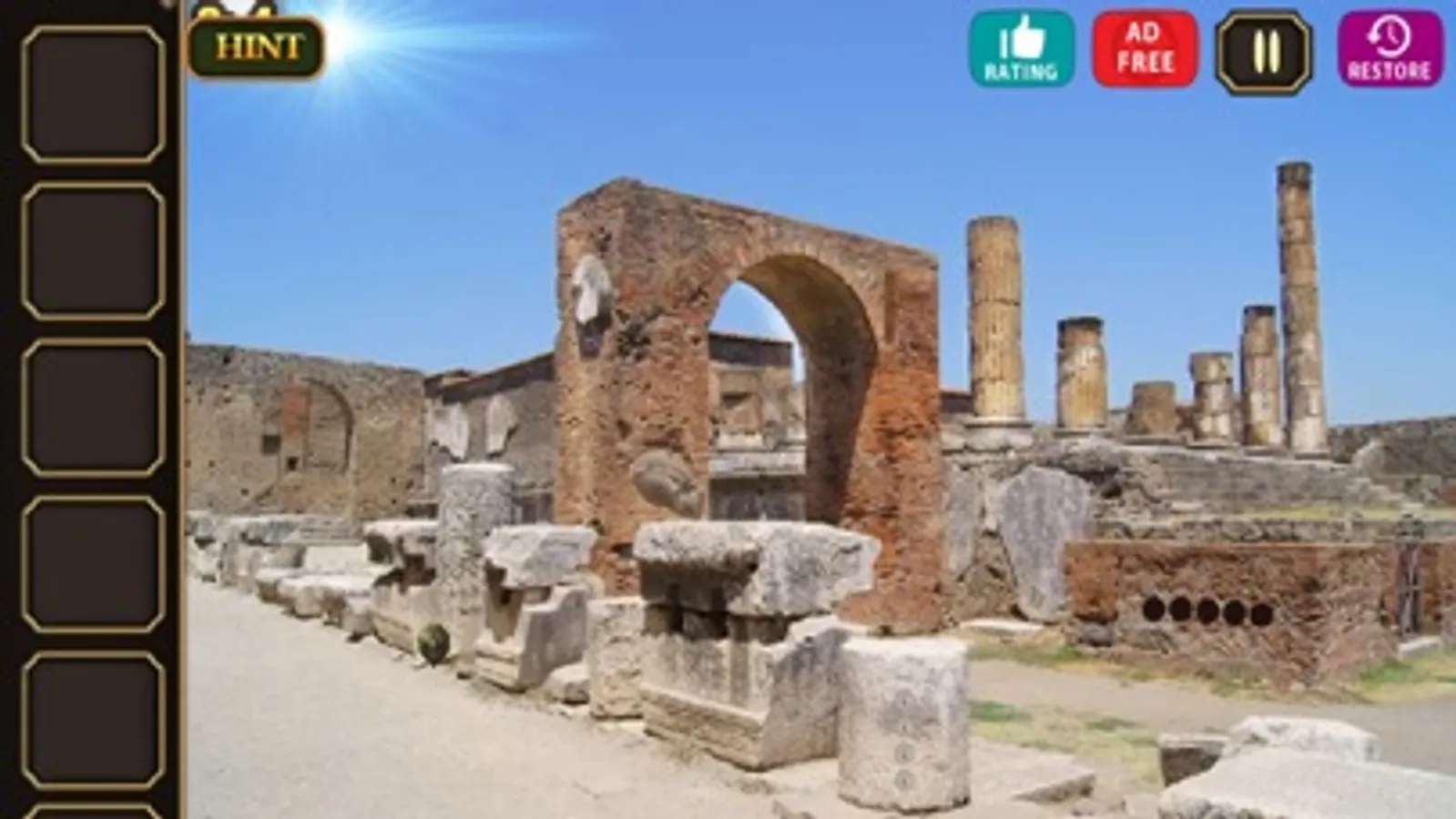 Assume that you are on a trip to Italy to visit places of your interests. You are sightseeing the ancient roman city Pompeii. You are looking at the dilapidated buildings and the ruins of Pompeii with great interests. Suddenly you find that you have been trapped inside the ruined city and you are unable to go out. You will have to escape from this ancient city by finding a way. Look for clues and objects to solve puzzles and escape from the city.