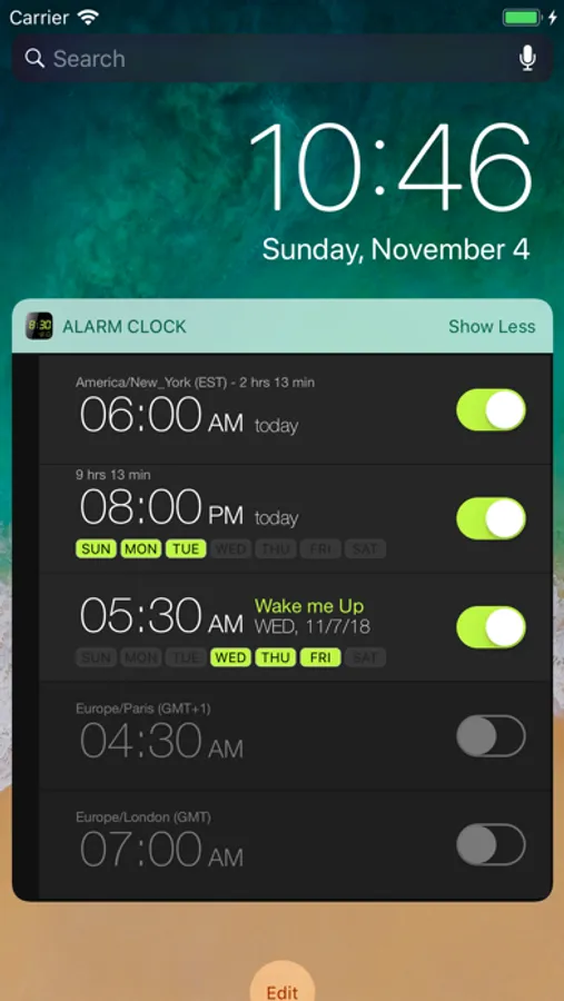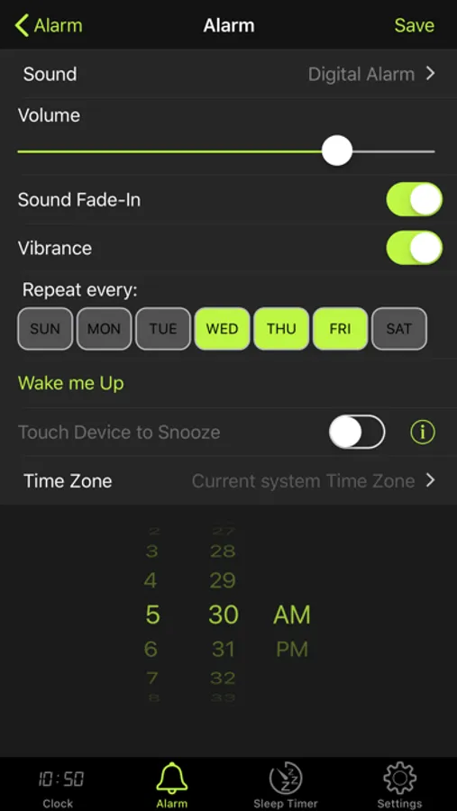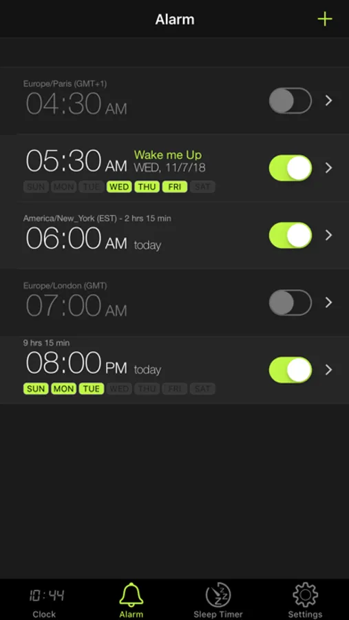 - Add alarm: tap "+" button or double tap on "Alarm" icon