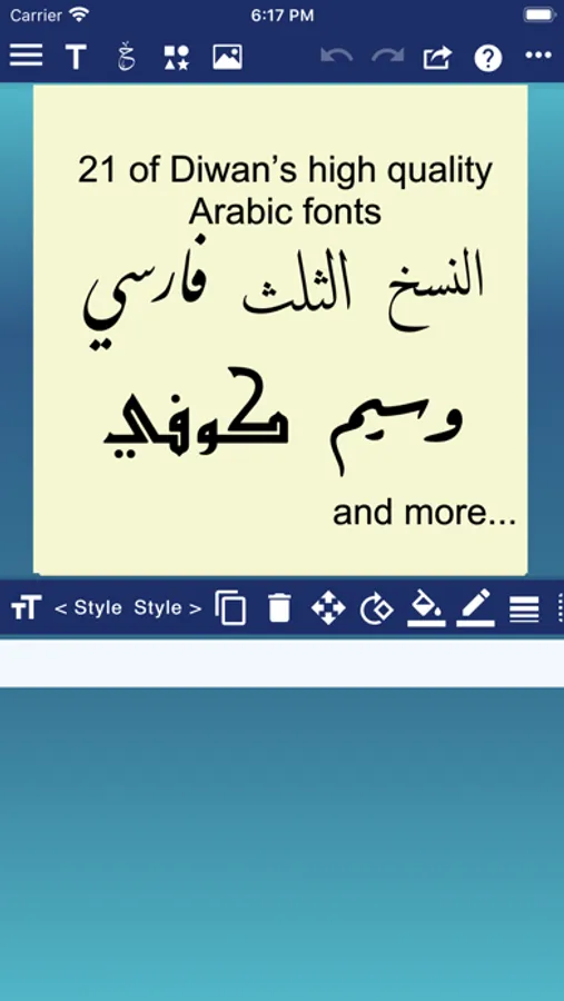 - Choose from a collection of 21 fonts including Diwan's most advanced Arabic fonts like Diwan Naskh Mishafi, Diwan Thuluth, Diwan Farsi, Waseem (Ruqa’a like font), Kufi, and more.