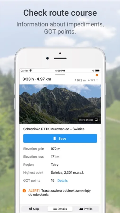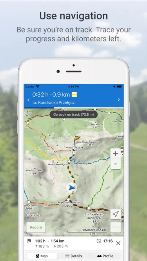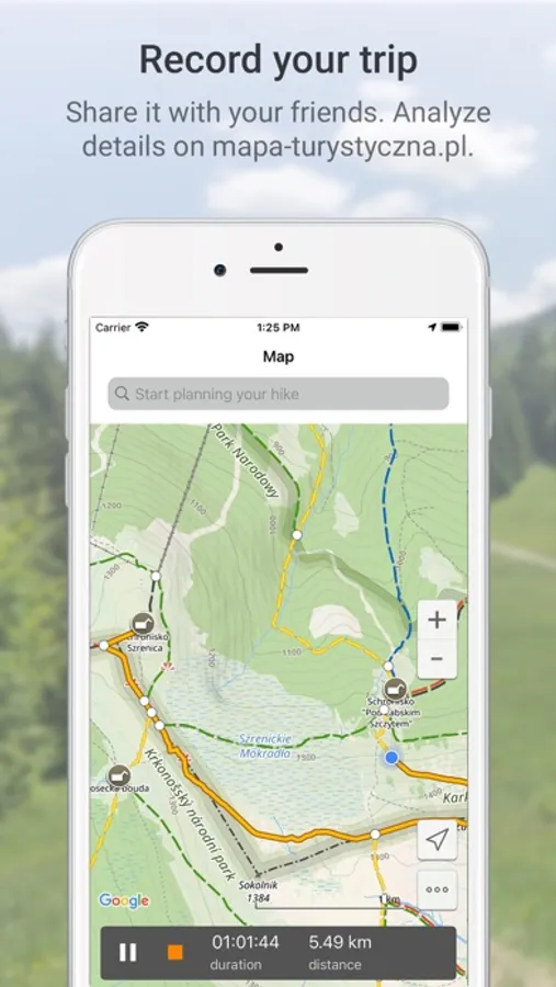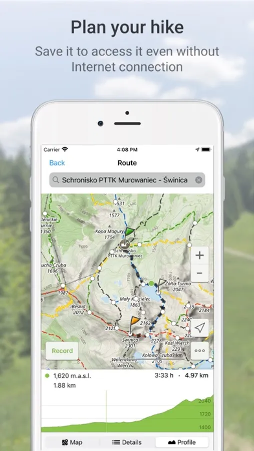 The main functionality is planning routes leading along official hiking trails in the mountains and foothills of Poland. The app finds a route quick and easy, displays it on a map, shows its length, estimated time, detailed course and elevation profile. It also shows your current location.