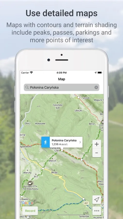 Routes are displayed on detailed Touristic map layer with contours and terrain shading, which contains peaks, passes, parkings and other points of interest. It's also possible to download maps of regions listed further in this description and use them offline.