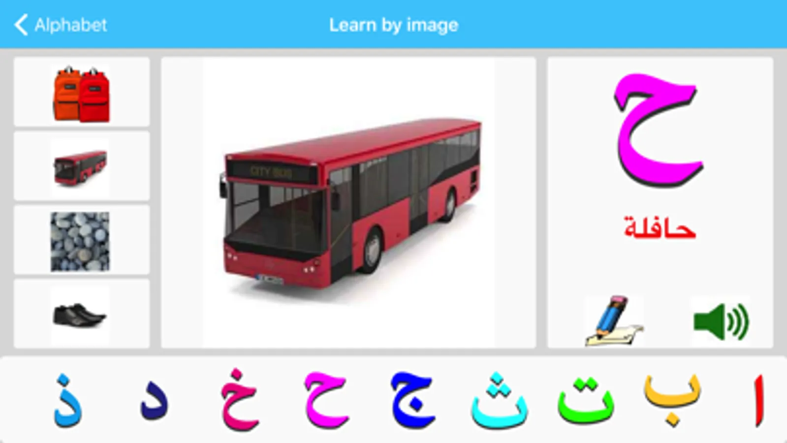 Arabic alphabet - listen, read and write. This is an educational app for preschoolers or toddlers to learn Arabic alphabet from ا to ي and numbers from ١ to ٩. Kids learn the alphabet and numbers along with how to read it and how to write. Your kids will enjoy playing with this app and will learn alphabet and numbers with pictures quickly.