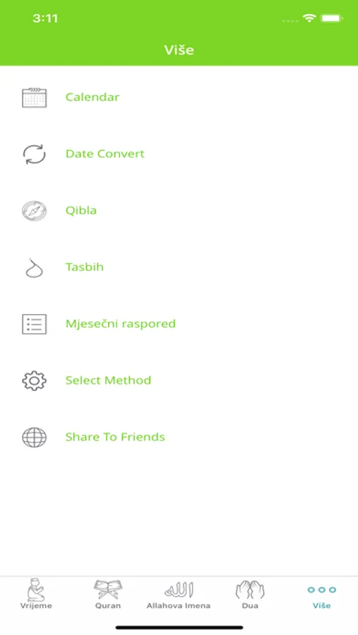 Ova aplikacija sadrži mnoge korisne funkcije za muslimane kao što su MP3 Kur'an sure, Abdest, salata, Hijri kalendar, datum konverter, pravac Kible, specijalni islamske dana, 99 ime Allaha, Top Sura i stihovi, Duas, u neposrednoj blizini džamije.
