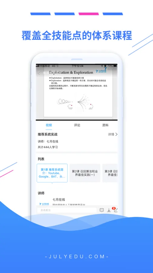 七月在线是国内领先的人工智能教育平台,产品内容涵盖全系列的人工智能课程、国内首套人工智能题库。平台内有大量免费、优质的课程内容,所有课程均偏向工程应用,用实际数据、案例、代码说话。
