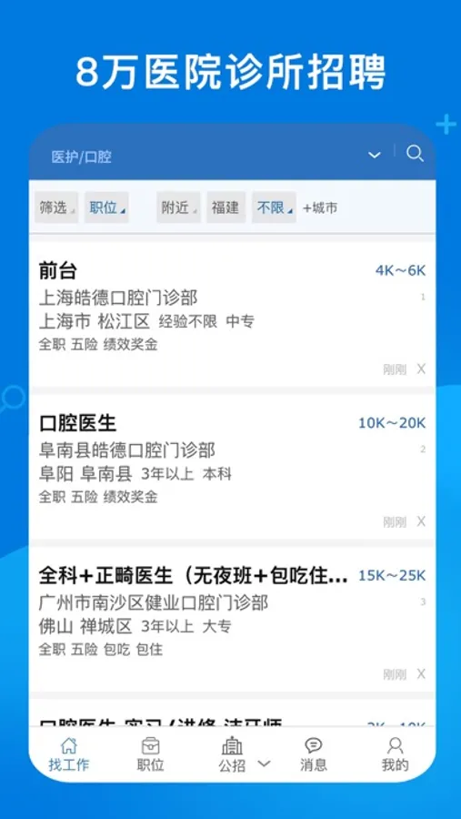 招聘栏目有:10万家单位提供医院招聘、门诊招聘、诊所招聘、养老院招聘、月子中心招聘、护士招聘、义齿招聘、药店招聘、医药公司招聘等,