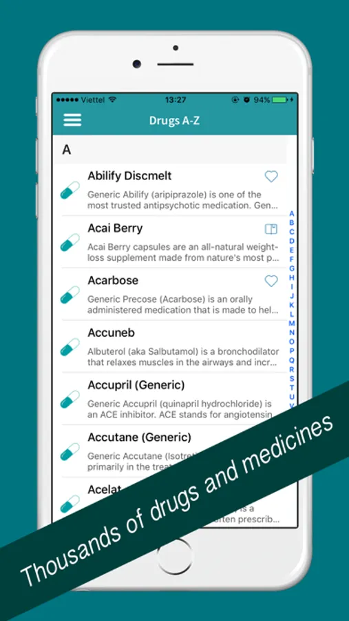 Drug Dictionary is a medical hand book that provides all information about drugs used for medication: uses, dosage, how to take, side effects, precautions, drug interactions, missed dose and storage.