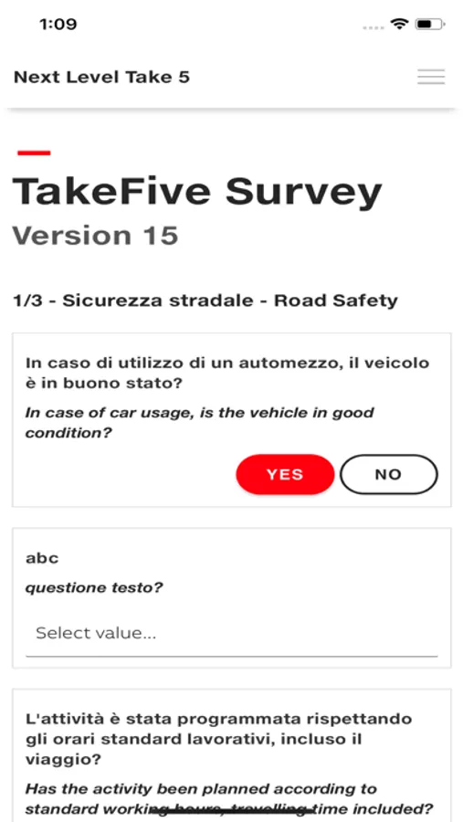 Take 5 App supports the execution of on-site security surveys. Technicians receive the survey they need to compile directly on their smartphone or tablet. The questions of the survey are made by a responsible person that can send it to his/her own staff of technicians.
