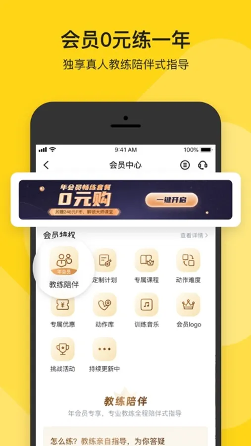 - 独享专业教练陪伴指导,给你一对一的训练建议,陪你一起进步;