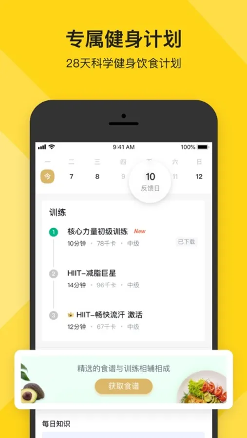 - 根据你的健身目标和基础,适应你的训练日程,度身定制四周个人专属训练计划;