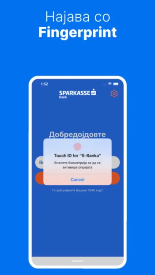 За активирање на апликацијата за мобилно банкарство со привилегија плаќање потребно е да посетите некоја од најблиските експозитури на Шпаркасе Банка. По поднесеното барање за активација, ќе добиете кодови за активирање на апликацијата S-Banka, односно СМС порака со корисничко име и e-mail во кој ќе Ви биде доставена иницијална лозинка. По успешната активација потребно е да внесете нов ПИН за најава и да го потврдите истиот.