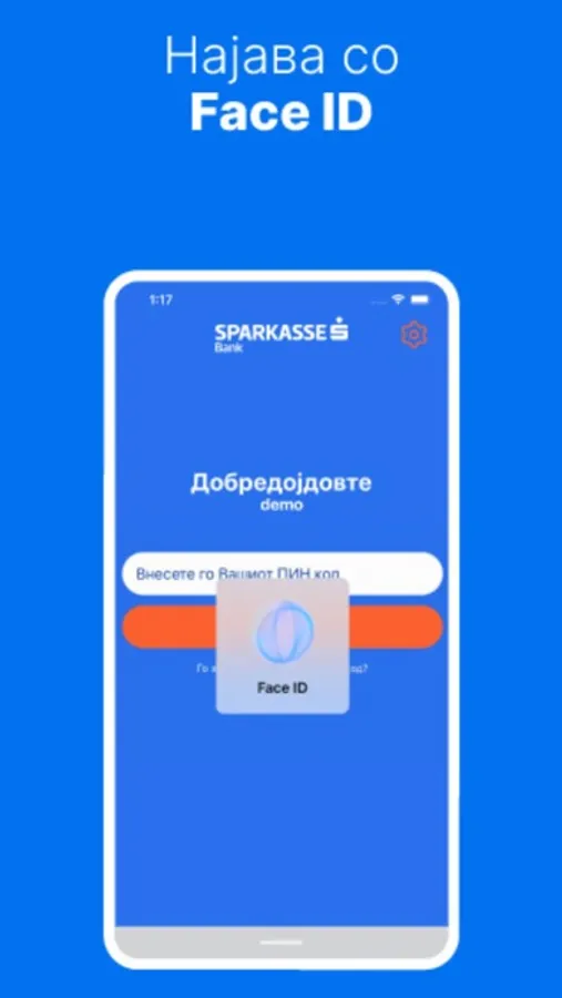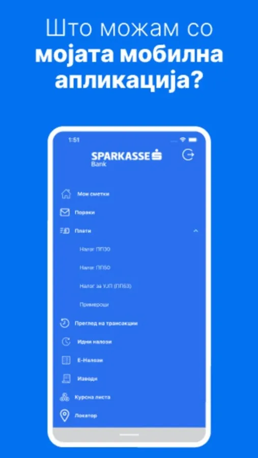 Мобилното банкарство на Шпаркасе Банка АД Скопје е апликација наменета за паметен телефон и/или таблет која може да ја инсталирате од кое било место со пристап до интернет со што на лесен и едноставен начин ќе имате 24-часовен пристап до сите производи и услуги наменети за физички и правни лица од Шпаркасе Банка.