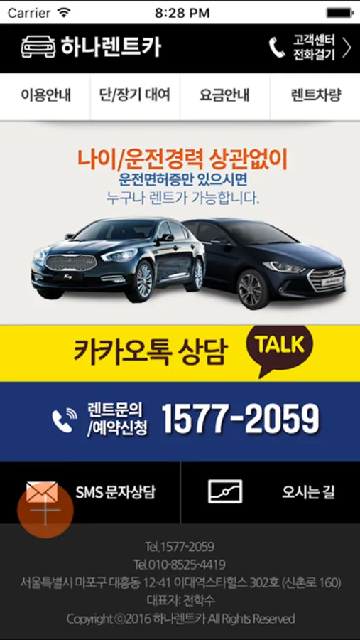 저희 하나렌트카는 서울특별시 마포구 대흥동에 위치하고 있으며 나이/운전경력 상관없이 운전면허증만 있으시면 누구나 렌트가 가능합니다.