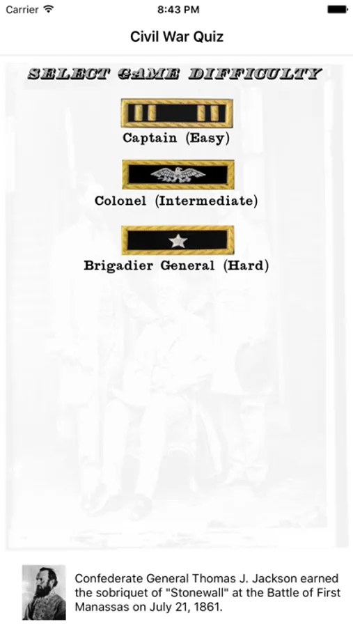 To commemorate the 150th anniversary of the end of the war, Civil War Quiz will test your knowledge of this turbulent period in American history. Challenge yourself on three different levels of difficulty. Earn your own officer's star through a series of random questions spanning the range of events from the battle of Glorieta Pass in New Mexico to the bloody fields of Antietam.