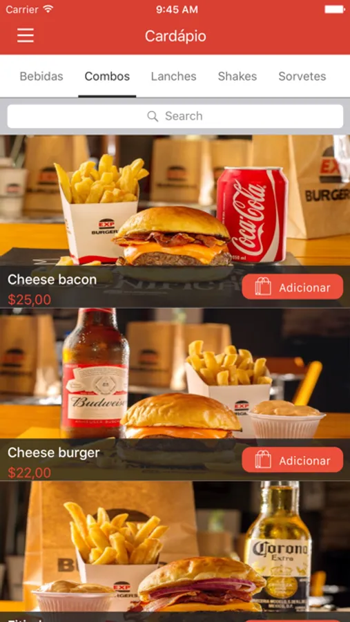 Nosso cardápio tem opção de combos. Um número 2, chamado GTW com hambúrguer, queijo e cebola caramelizada com batata doce frita e refrigerante lata. Já o número 1, com bacon, queijo prato, cebola roxa e molho especial, com os mesmos acompanhamentos.