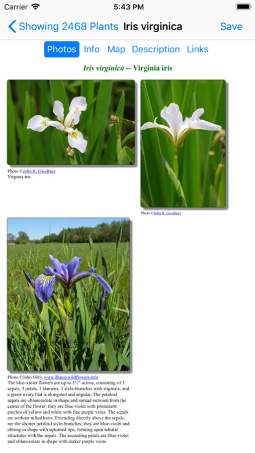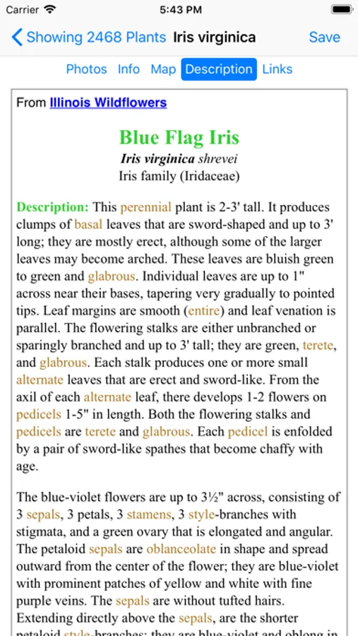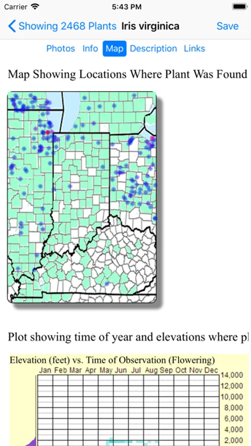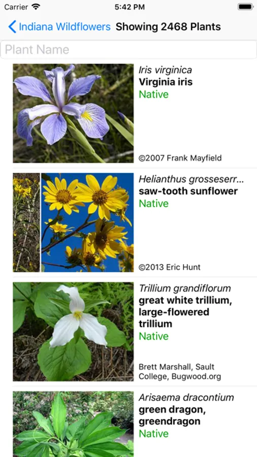 The App includes 2,689 species of plants found in Indiana. Overall, 1,422 are "Wildflowers", 209 are shrubs, 182 are broadleaf trees, 19 are conifers, 71 are vines, 484 are grass-like, 73 are fern-like, 218 are moss-like, and 109 are lichen.
