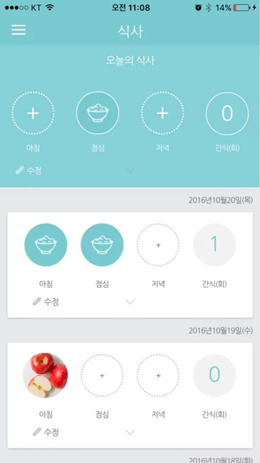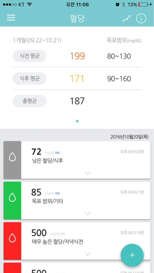 - 기기연결 : 혈당기기와 BLE 통신으로 연결하여 자동으로 데이터를 가져옵니다.