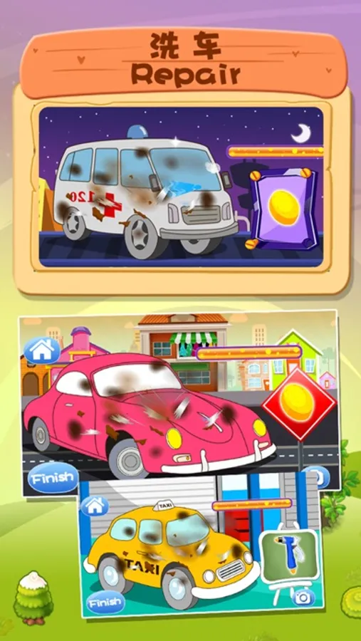 Car washing & repair: Kids can select different car to wash and repair. This can enhance the kids' health habits. This also raise their awareness of cleanness. And they will also learn to finish a task step by step.
