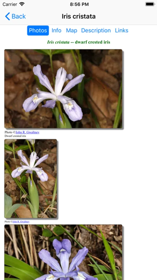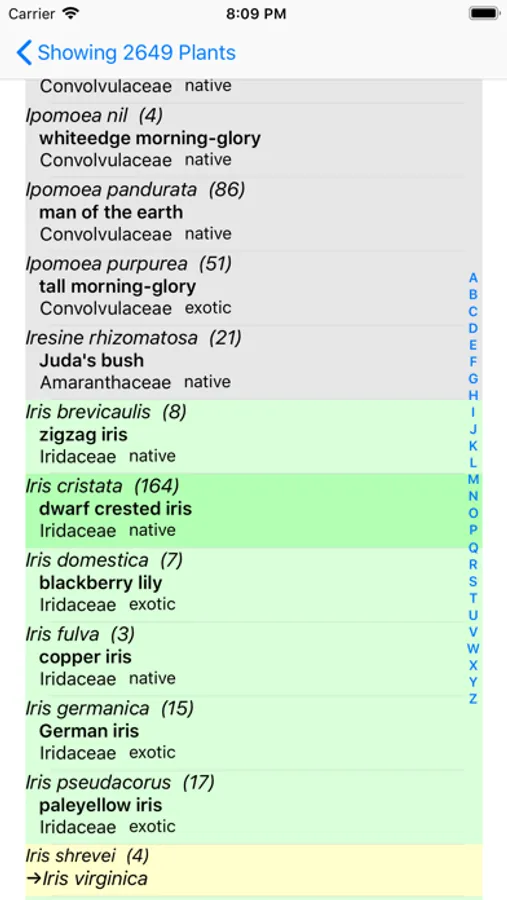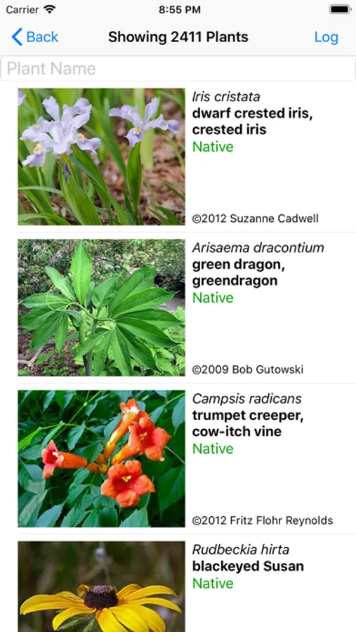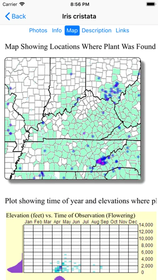 The App includes 2,845 species of plants found in Kentucky. Overall, 1,431 are "Wildflowers", 232 are shrubs, 213 are broadleaf trees, 22 are conifers, 82 are vines, 457 are grass-like, 78 are fern-like, 265 are moss-like and 185 are lichen.