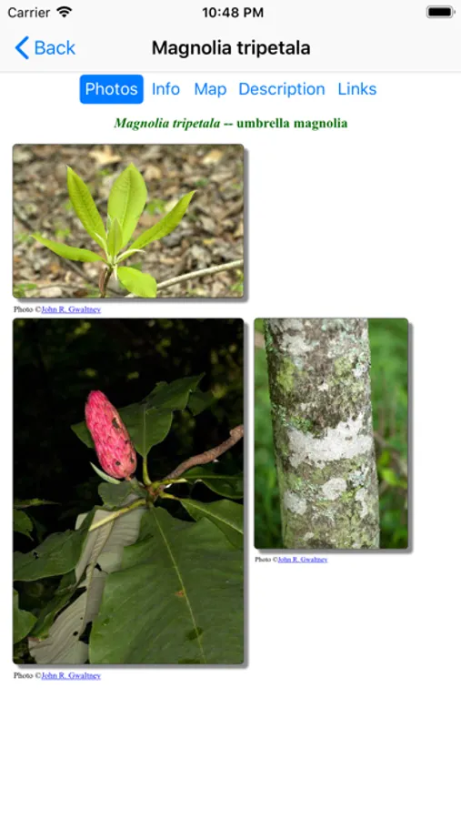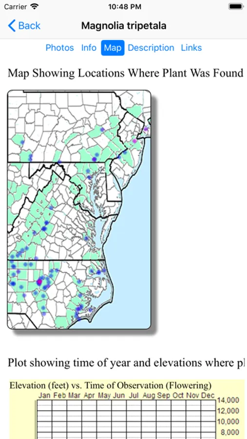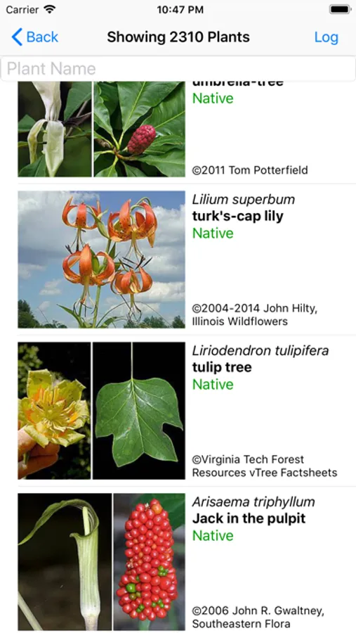 The App includes 3,061 species of plants found in Maryland. Overall, 1,495 are "Wildflowers", 267 are shrubs, 219 are broadleaf trees, 31 are conifers, 74 are vines, 534 are grasses and sedges, 81 are ferns, 203 are lichen, 255 are moss and 29 are seaweed.