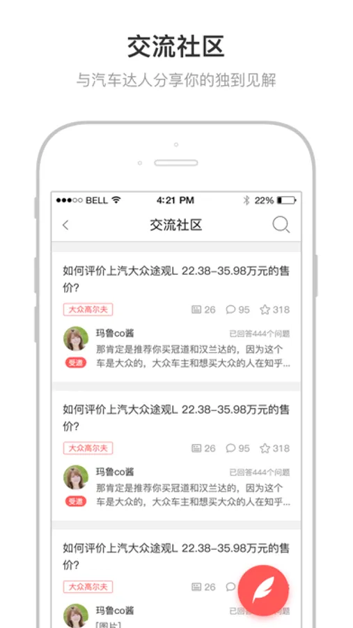 3. 交流社区 - 在这里,有专业的汽车顾问,帮你解答你对汽车相关的一切疑问。当然,你也可以把你所知道的知识告诉给所有人。