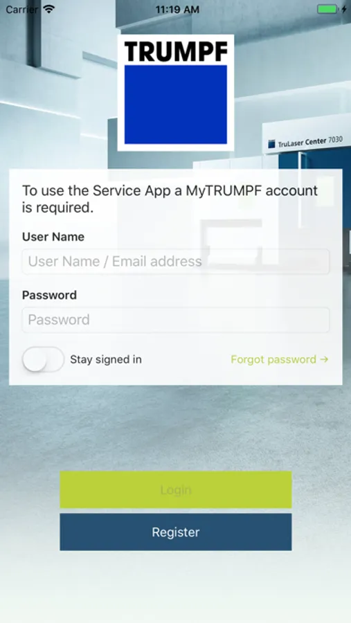 In order to use the app a free account for our customer portal MyTRUMPF is necessary. You can easily register for MyTRUMPF in the app after downloading it.