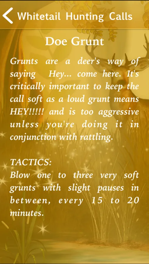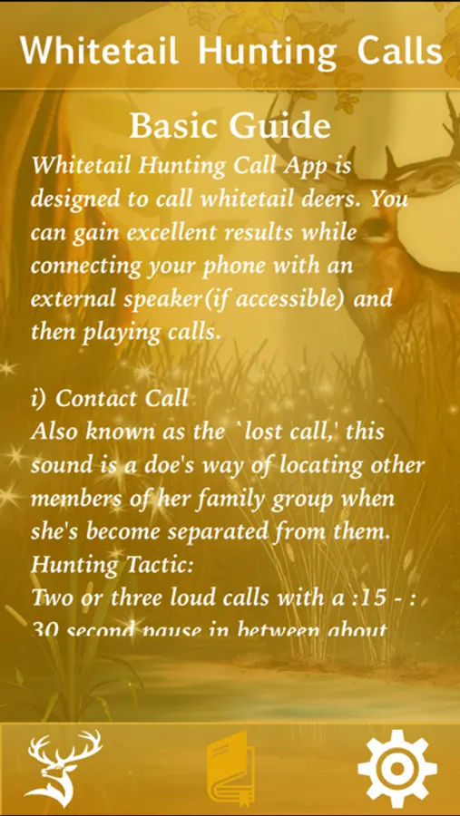 This app includes 10 calls for whitetail deers with instructions. The instructions allow you to read the description of every call and appropriate situation for using specific a call.This app is specially designed keeping hunters in minds having clear and big play, stop or change calls buttons for easy accessibility during difficult terrains.