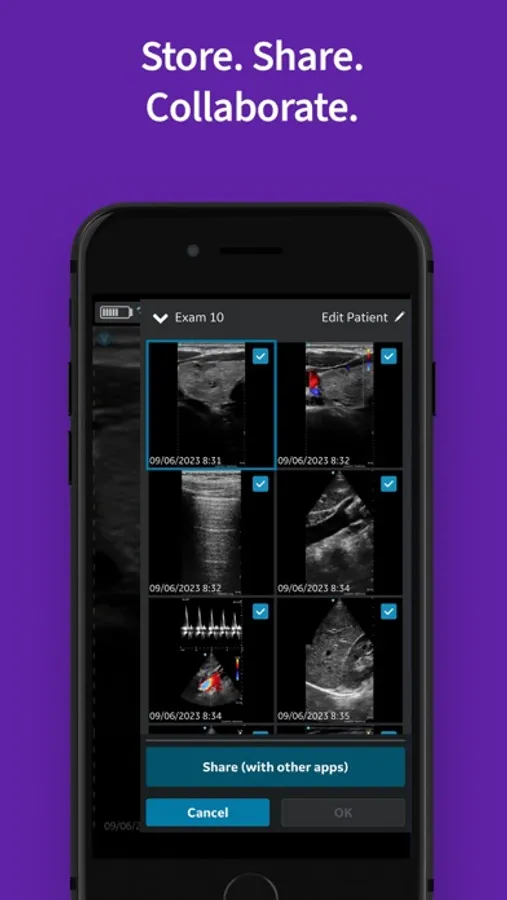Enjoy the flexibility of a wireless experience with wireless device connectivity and data sharing to your DICOM® server or shared network folders. Easily share anonymous exam images or loops to other apps, including your social feed, with just a few taps.