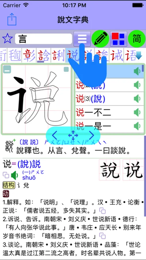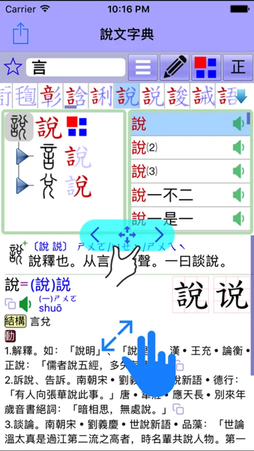 用〔單指〕點選〔釋義畫面〕中的字詞,即可查到解釋,並完整的紀錄查詢過程。可打開〔歷史紀錄〕點選過去的每一筆紀錄,可快速的恢復到每一個操作過的動作,包括〔偏旁樹、單字列表、詞彙列表〕皆可恢復到原來的狀態。這比書籤更好用,有助於重複的來回查看各種解釋。
