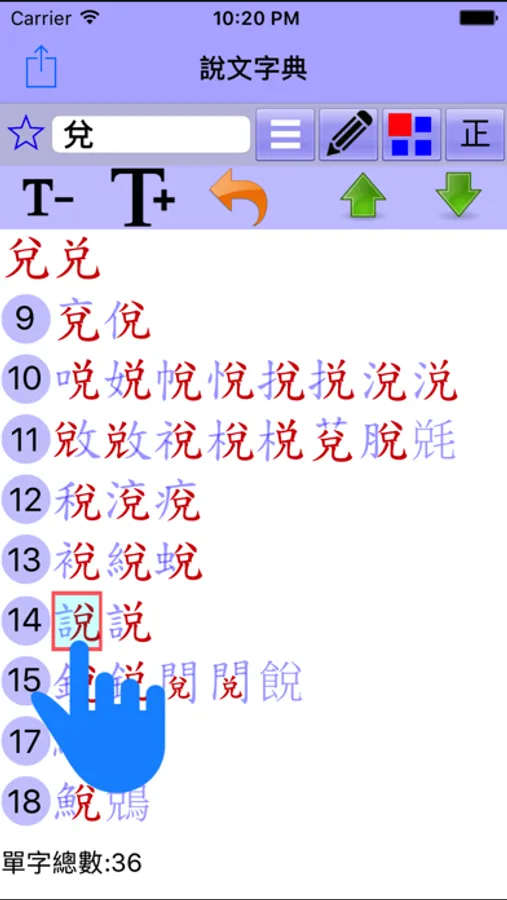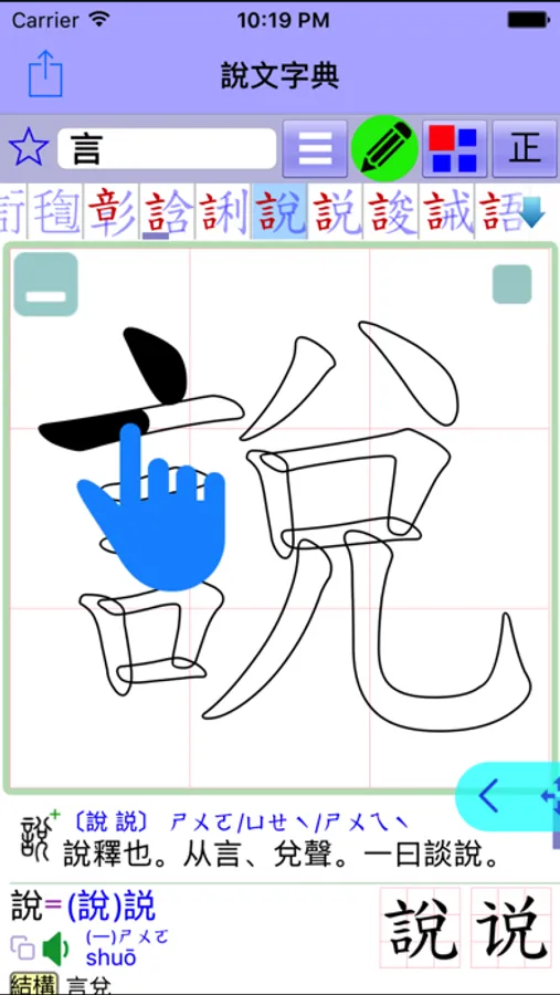 採用〔樹狀架構〕詳細解析單字的字形結構,同時列出〔小篆〕與〔楷書〕互相比對,還可打開每一層來觀察偏旁的位置及解析筆畫的變化,並且關連到〔詞彙列表〕,一個〔點選〕動作即可查看相關的解釋,省去繁瑣的查詢過程,提升學習的效率。
