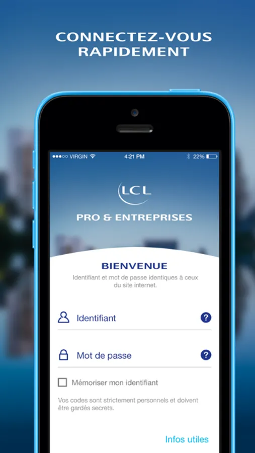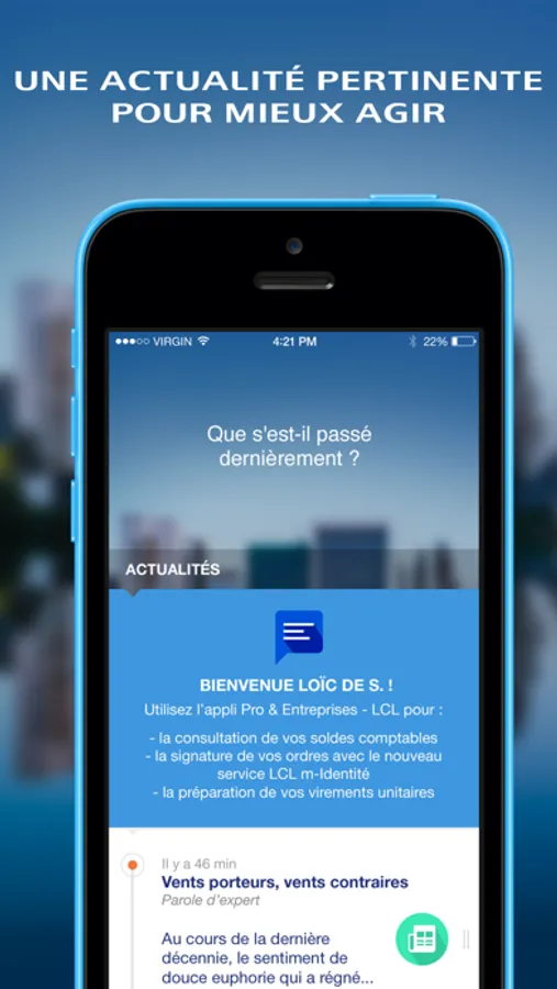 Téléchargez gratuitement l’application de votre banque, et connectez-vous grâce à vos identifiants habituels LCL Espace Pro ou LCL Entreprises, pour accéder à vos fonctionnalités :