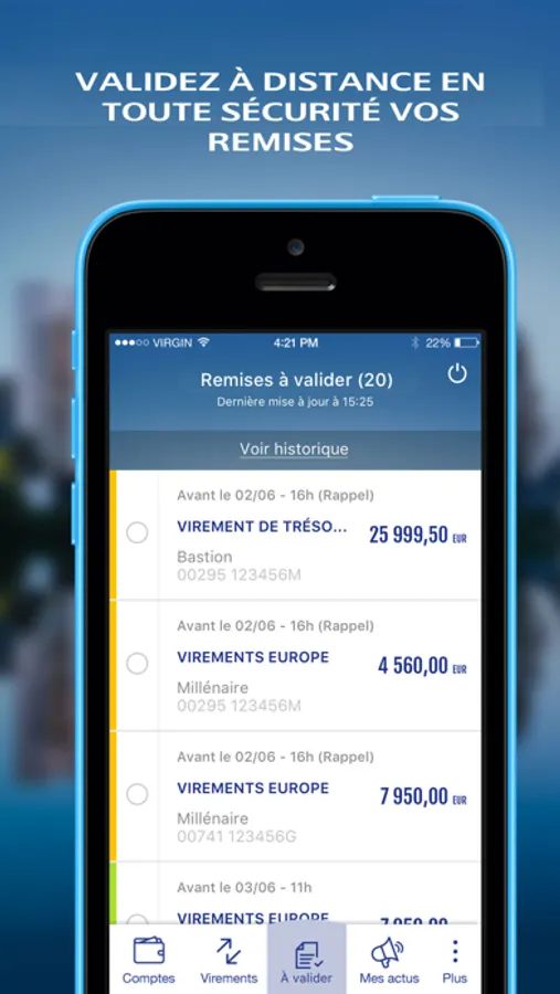 - A VALIDER : soyez alerté des remises d’ordres à valider. Vérifiez et validez électroniquement vos remises d’ordres de façon sécurisée grâce au service LCL m-Identité, et consultez l’historique des remises déjà validées.