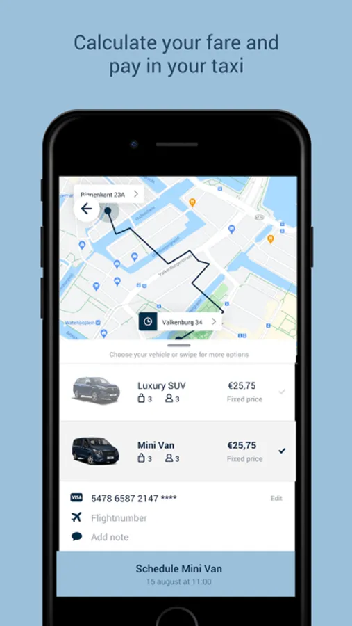 Quick login with your social media account or just enter your details. No cash in your pocket? No problem! The app allows several save payment options. Select your preferred payment method and link this to your account and receive your receipt by email directly after reaching your destination.