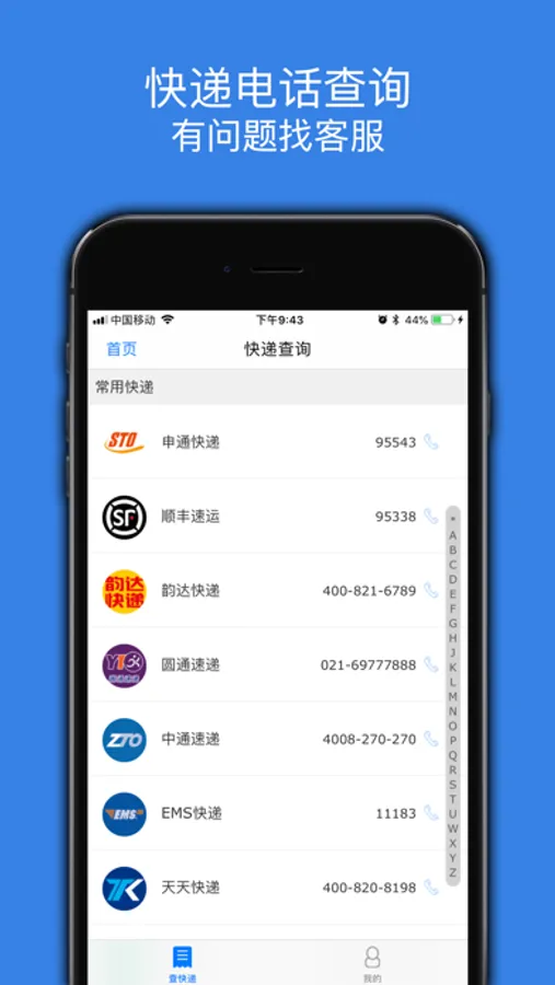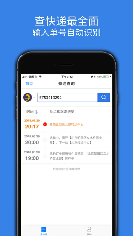 一款方便的递查询工具,实时同步各大快递公司数据,支持顺丰,圆通,申通,韵达,德邦,中通,百世,邮政,EMS,DHL,中外运敦豪等国际,国内快递公司,支持淘宝,京东,天猫的包裹;支持物流状态更新提醒。