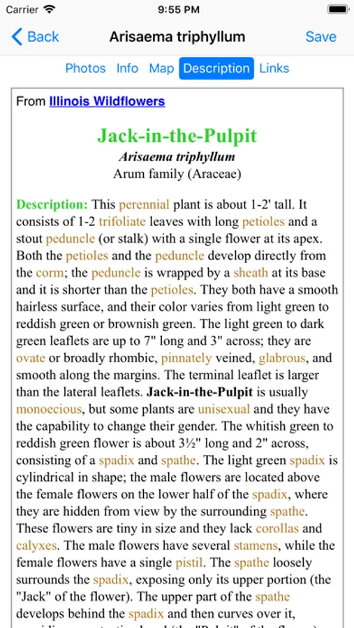 This App, which operates without an internet connection, helps find and identify plants. When you give the App information about a plant, such as its location, flower color and the time of year, the App will quickly show you which plants match your selections.