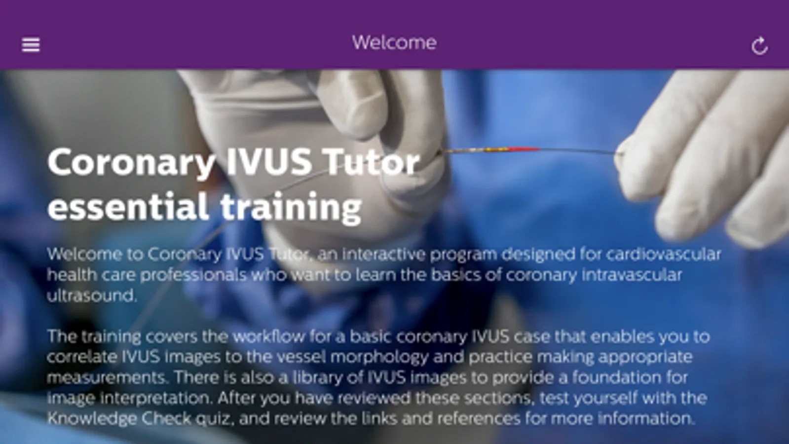 Welcome to Coronary IVUS Tutor app, an interactive program designed for cardiovascular health care professionals who want to learn the basics of coronary intravascular ultrasound.
